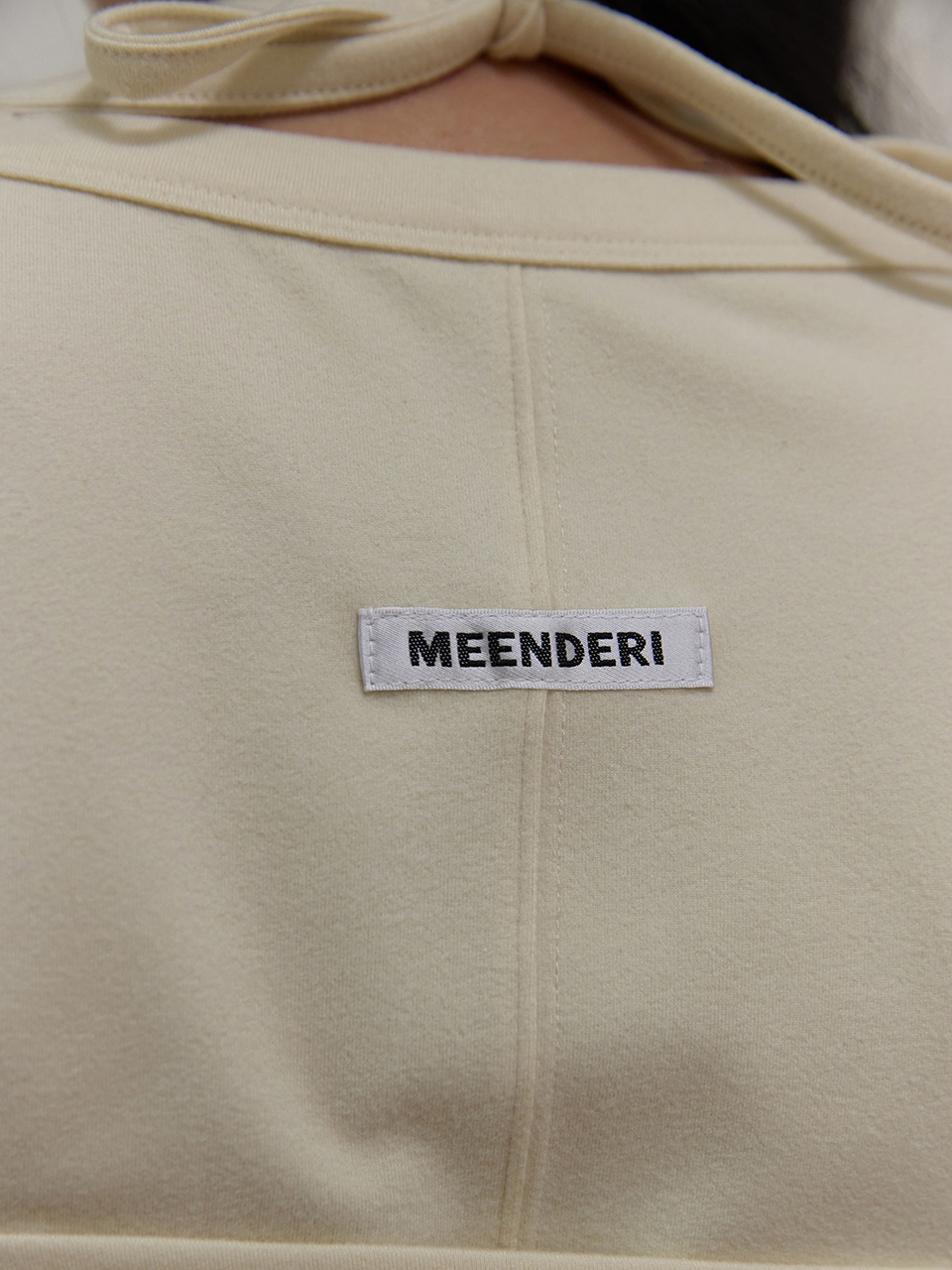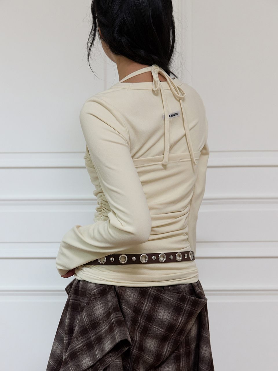 - 스트랩을 묶어 착용하는 홀터넥 디자인으로 길이 조정 가능
