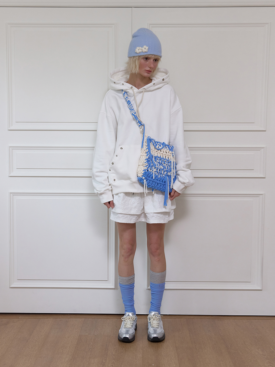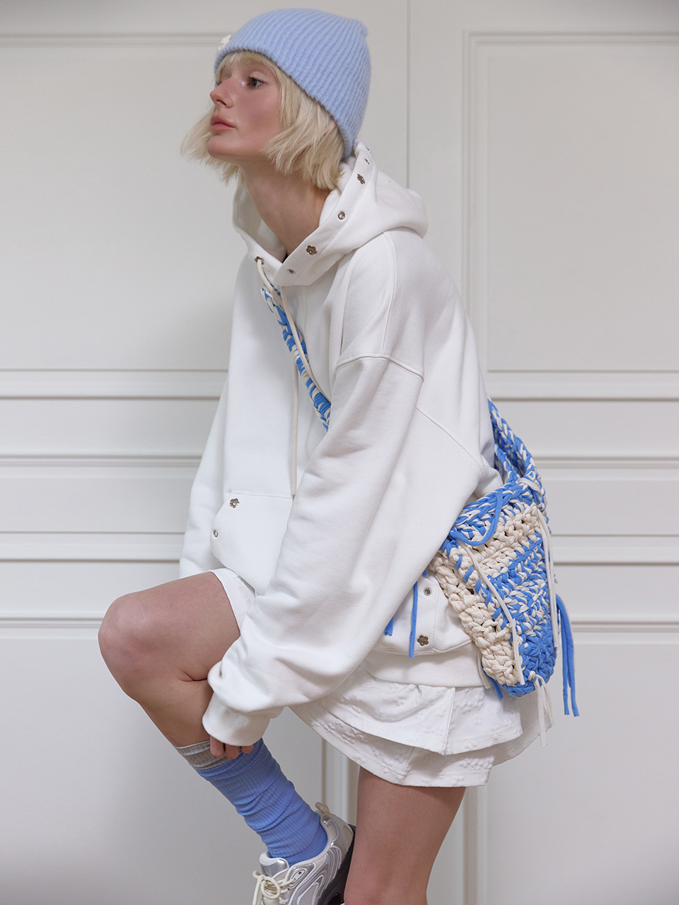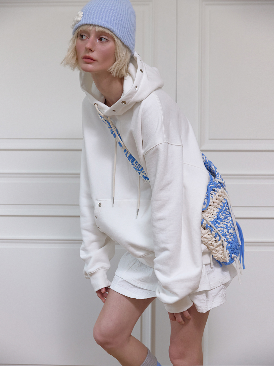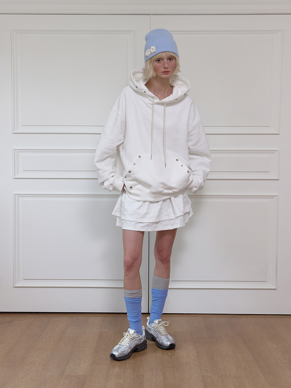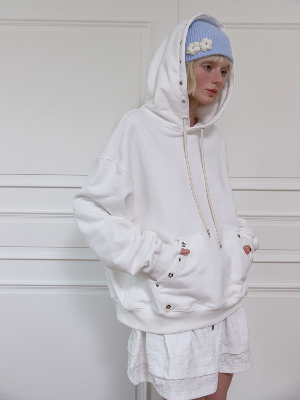 - 플라워 쉐입 아일릿 디테일이 특징인 남녀 공용 후드 티셔츠