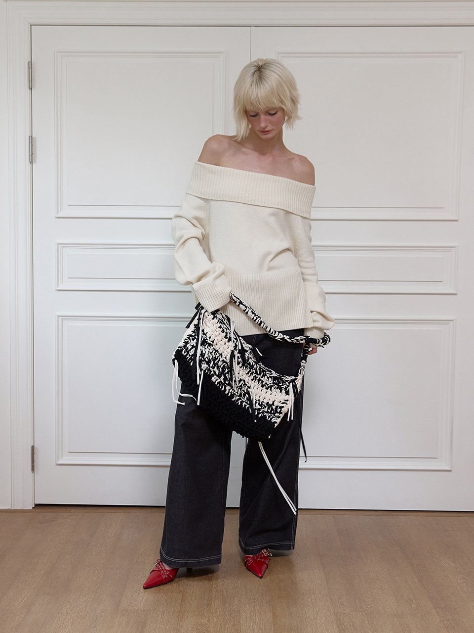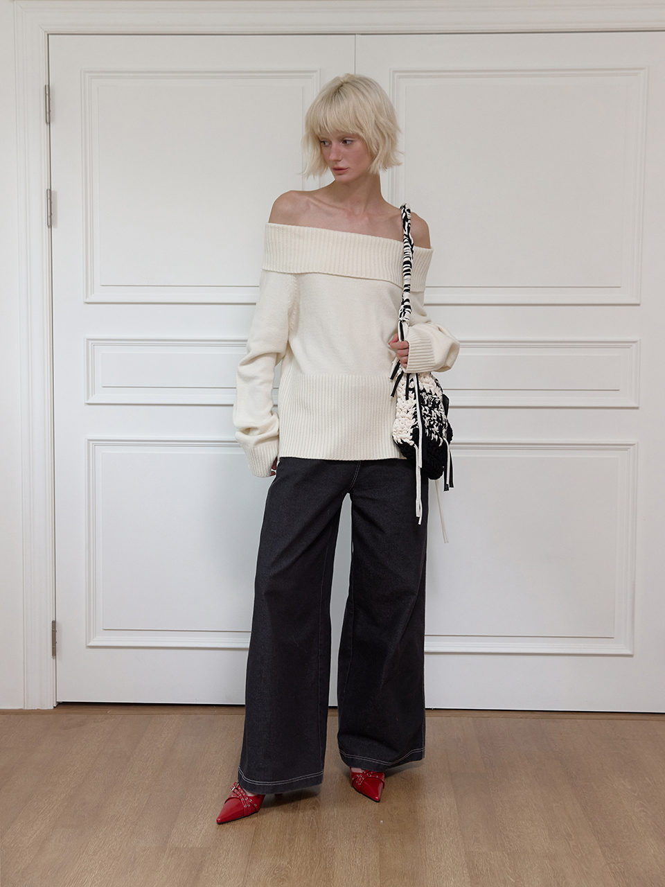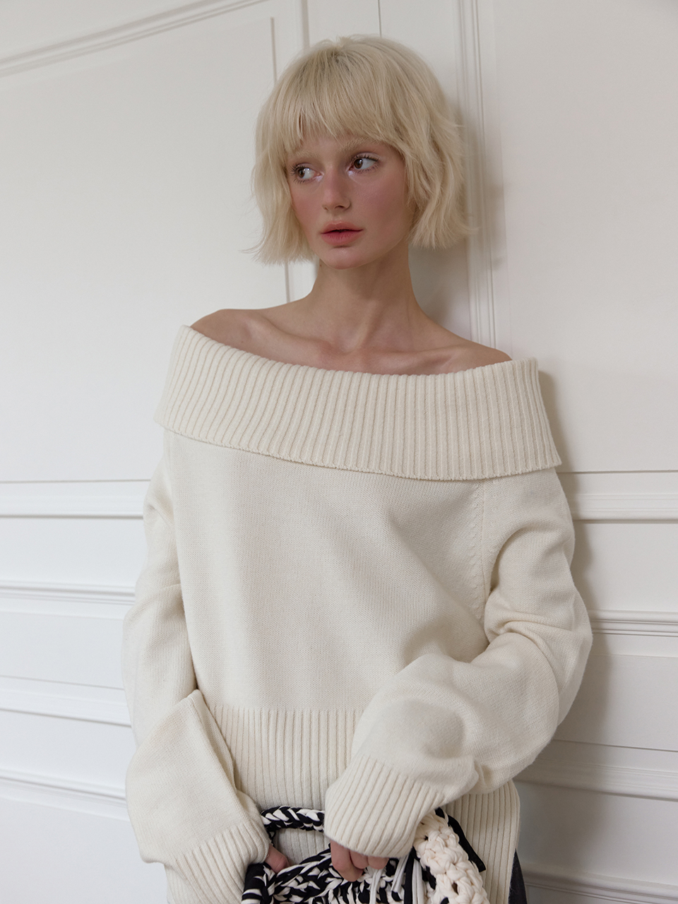 - 와이드 폴드 디자인의 오프숄더 니트 스웨터