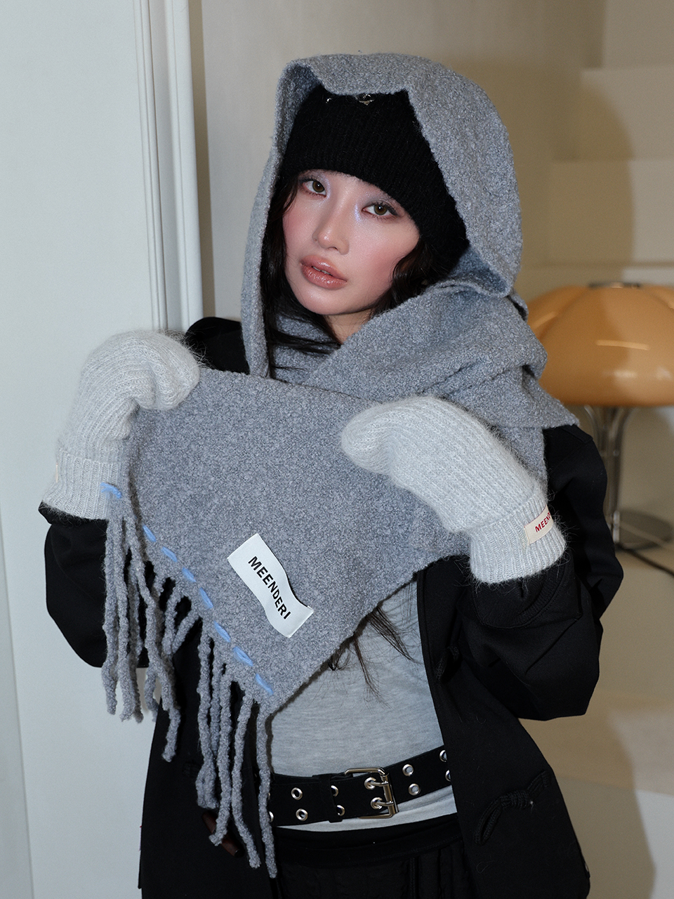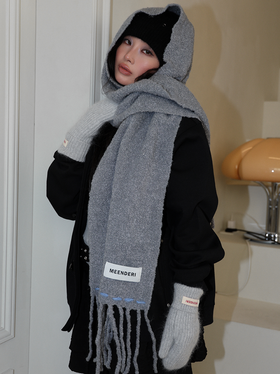 - 부클 원사로 제작된 니트 롱머플러