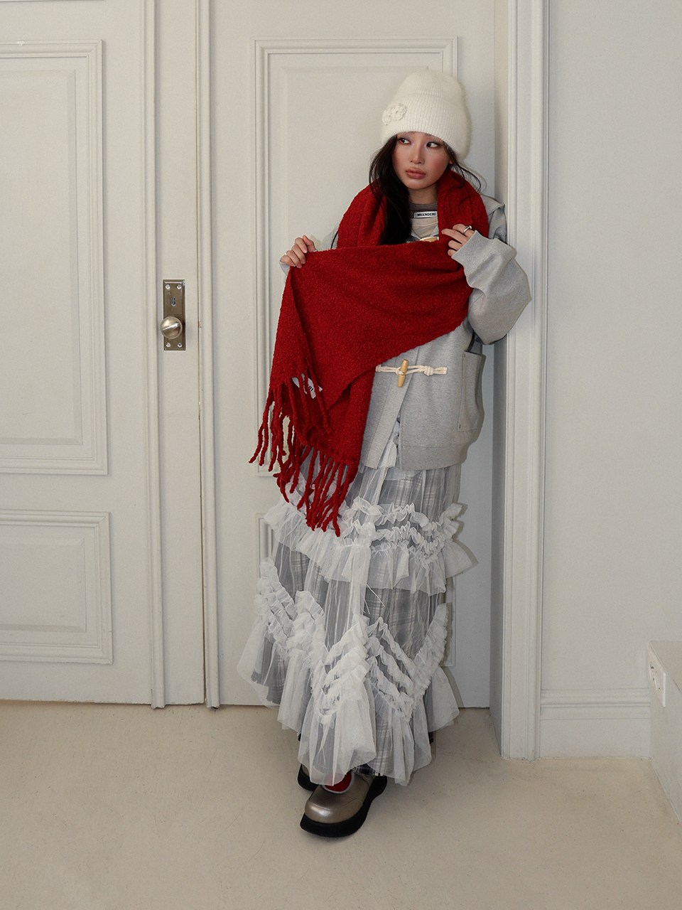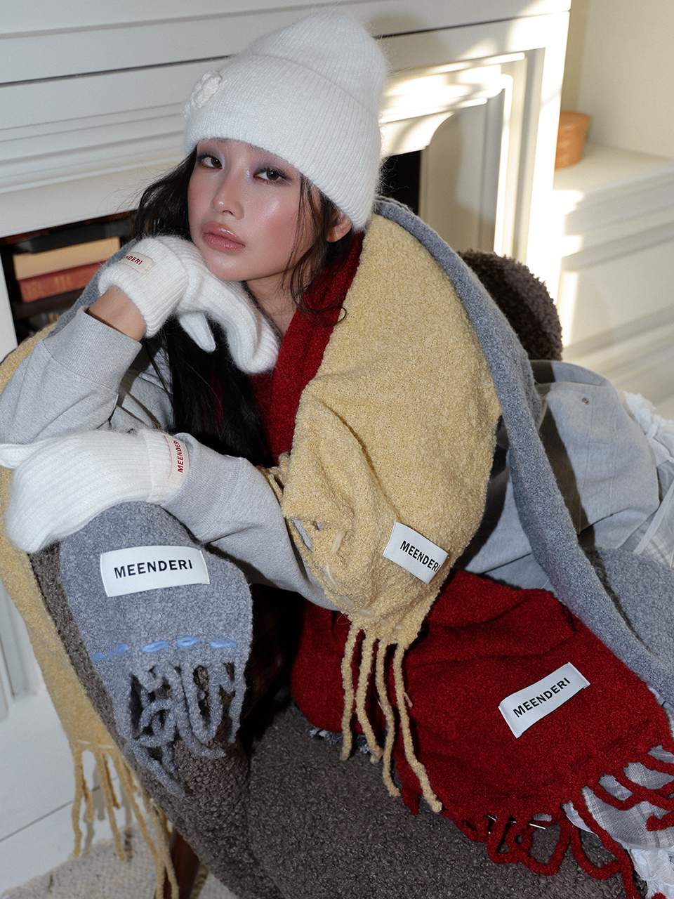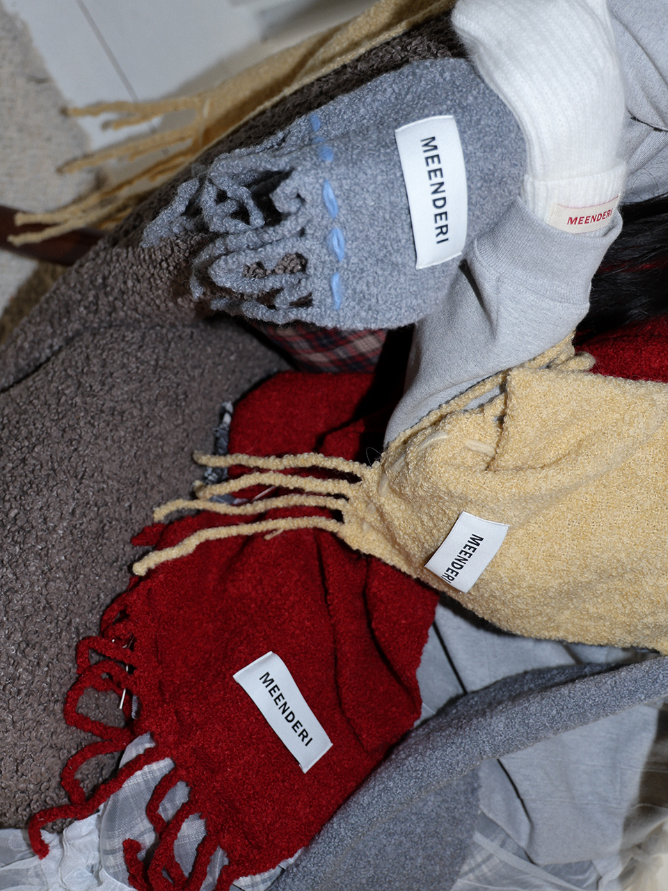 - 부클 원사로 제작된 니트 롱머플러