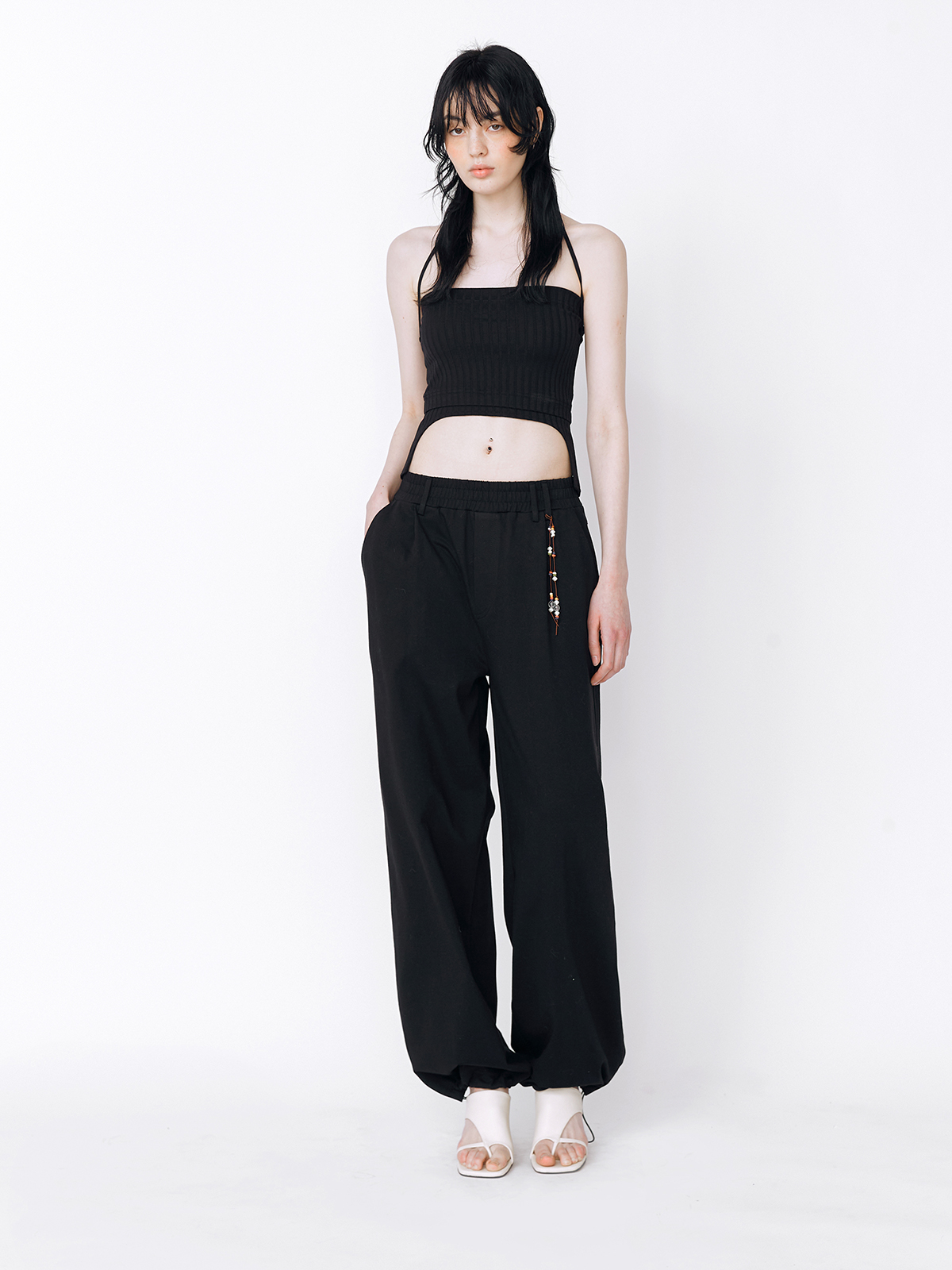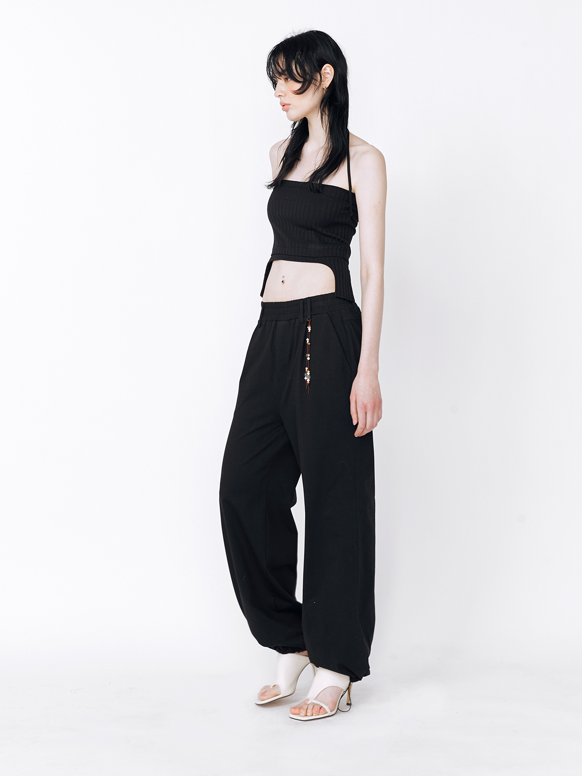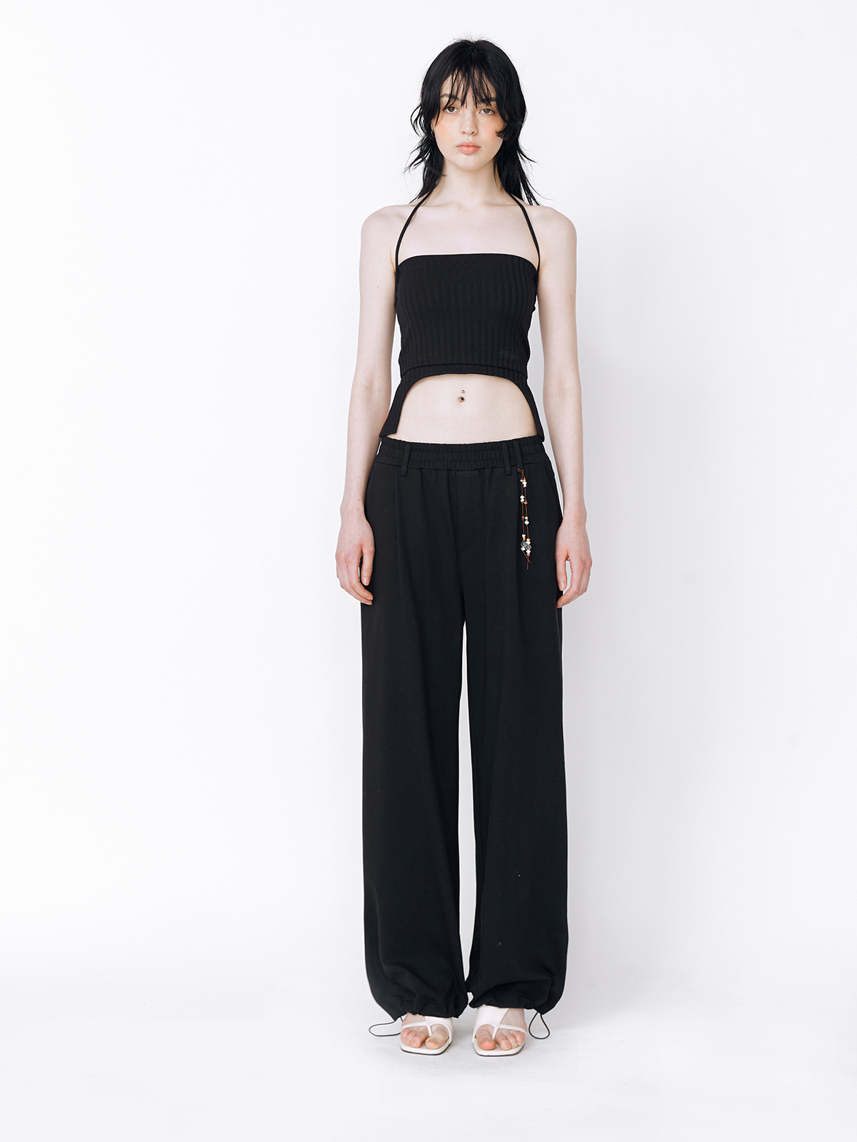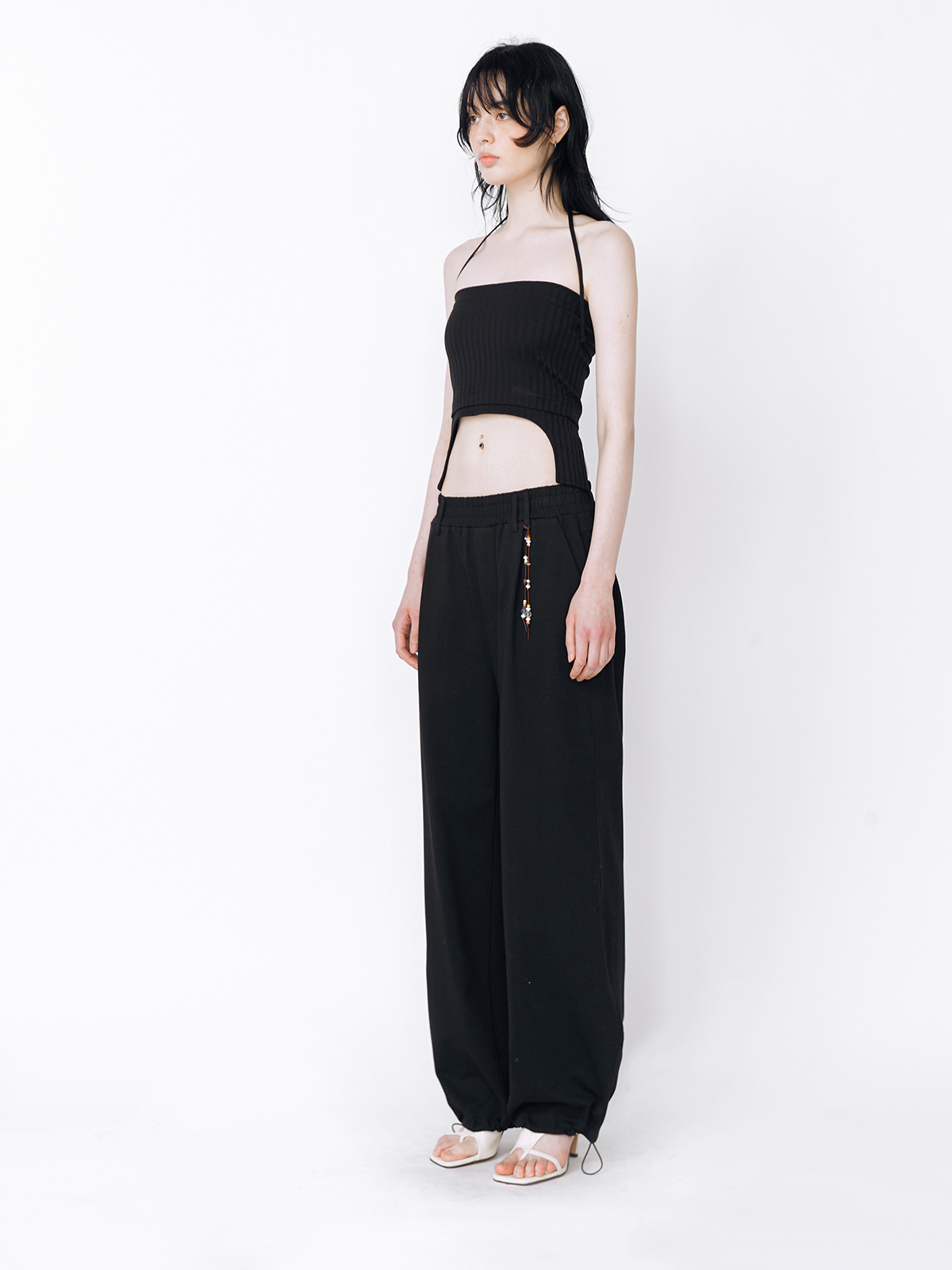 - 홀터넥 형식의 스트랩과 세로 골지 조직으로 슬림한 실루엣 연출 가능