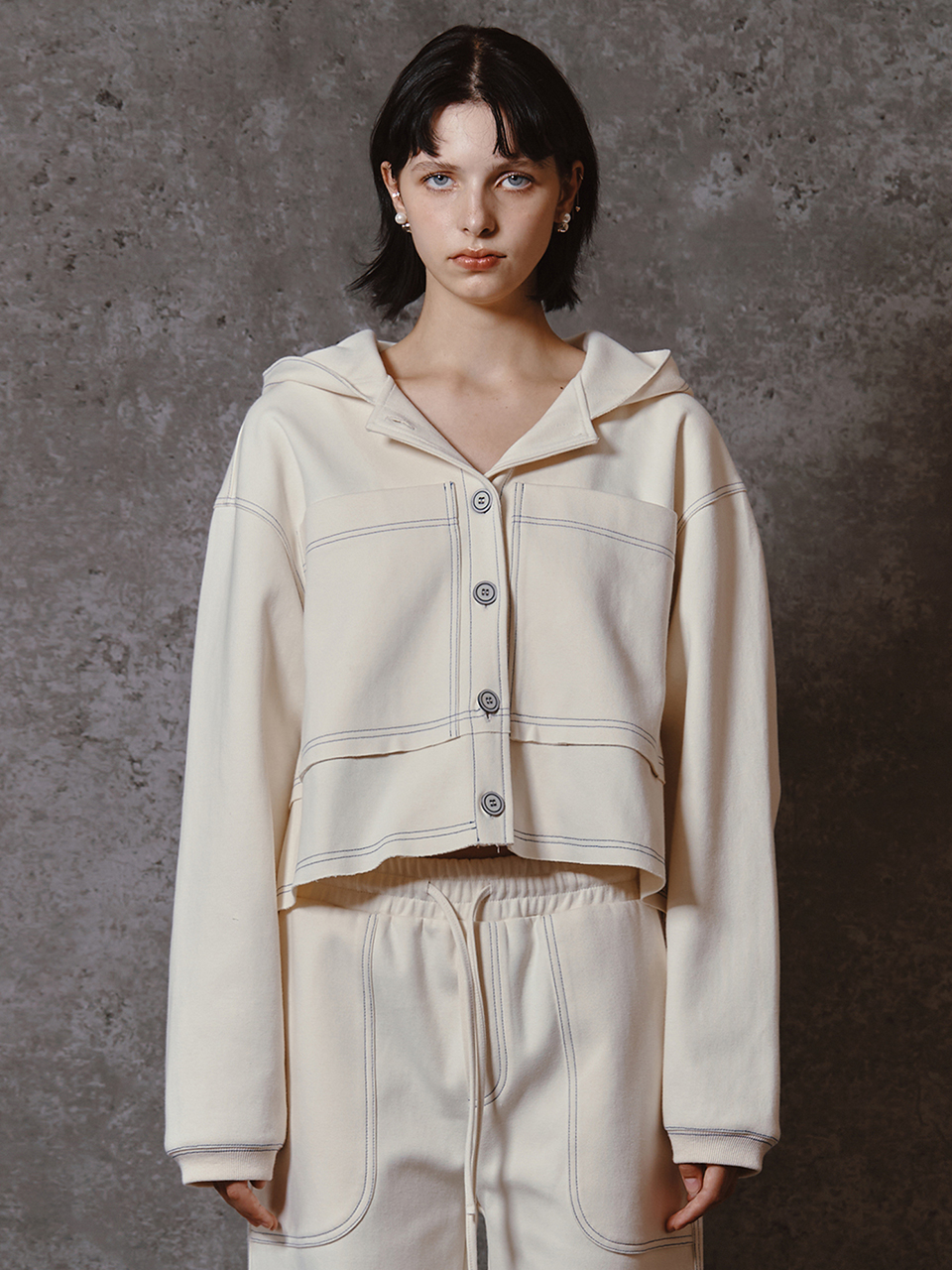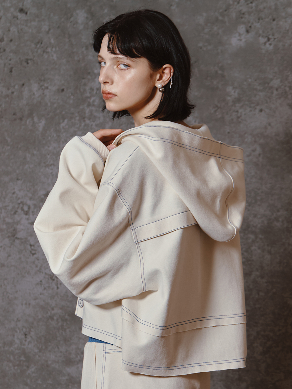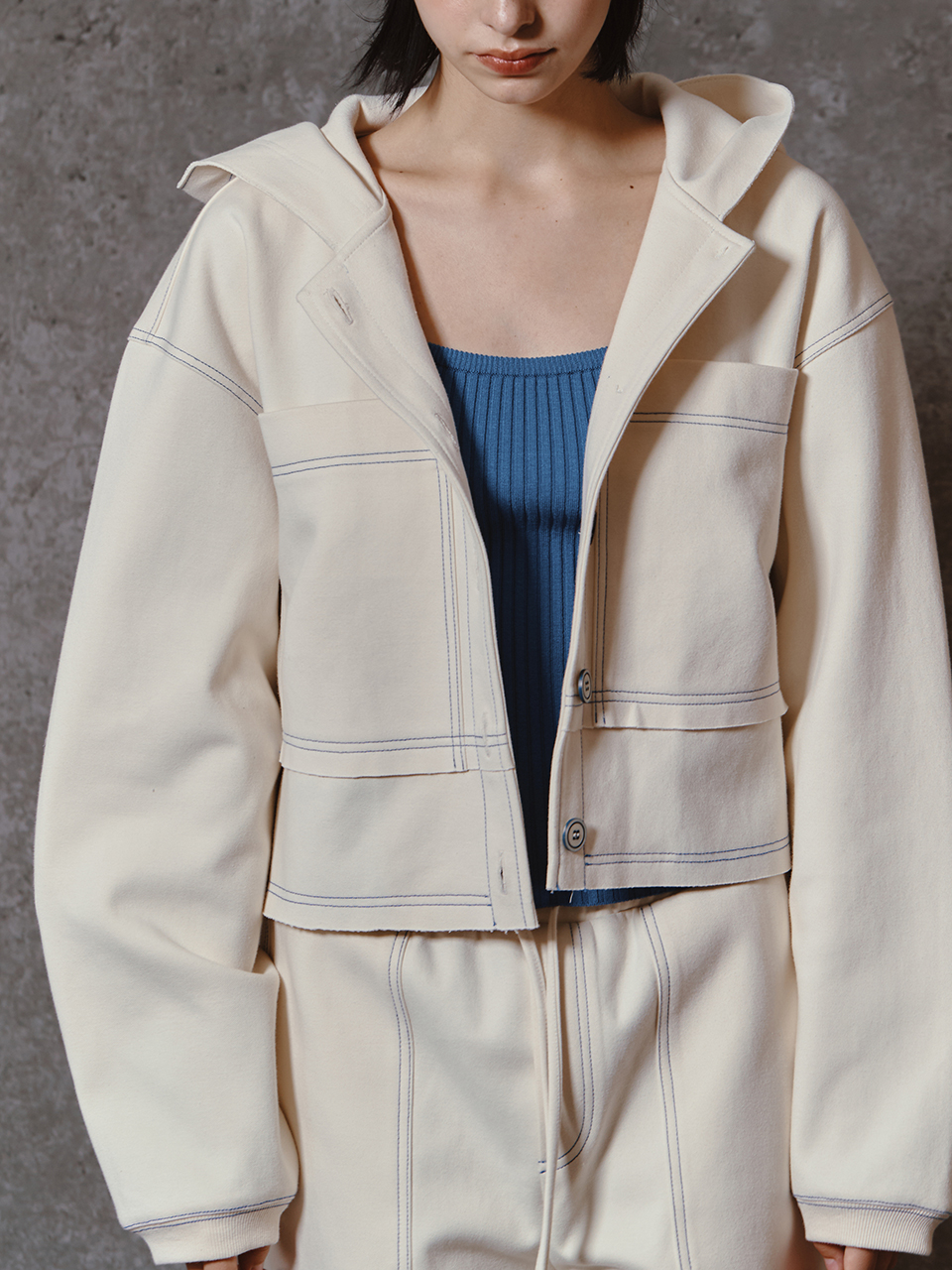 - 블루 버튼 및 배색 스티치가 포인트인 후드 크롭 재킷