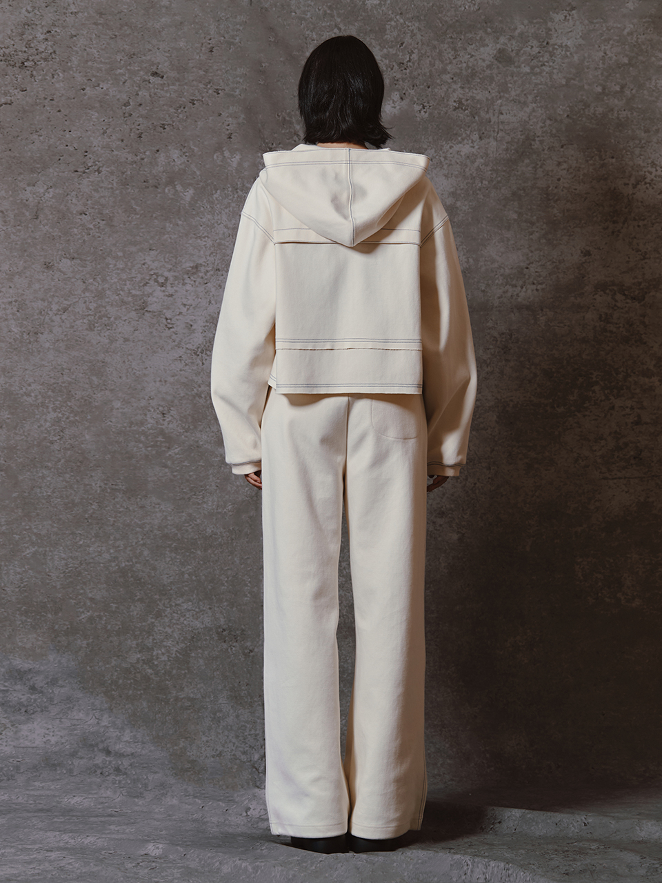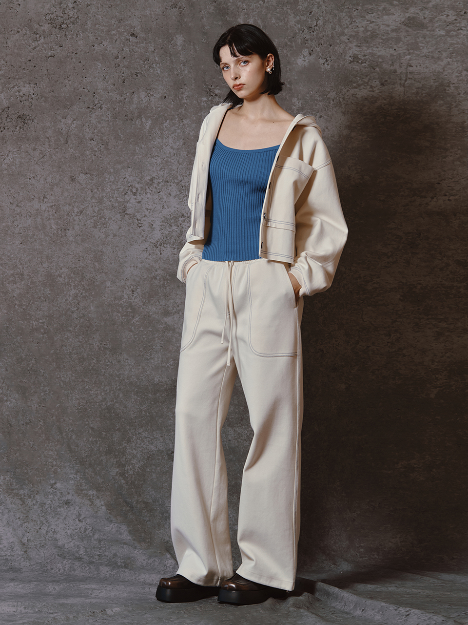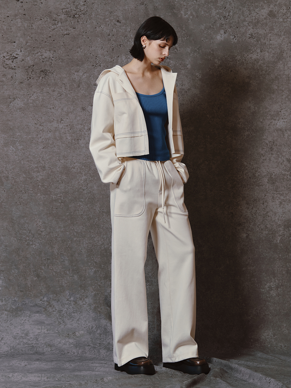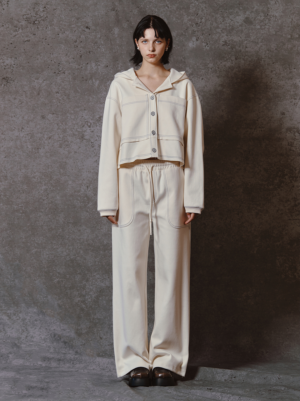 - 블루 버튼 및 배색 스티치가 포인트인 후드 크롭 재킷
