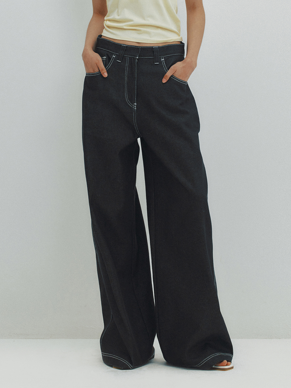 - 화이트 배색 스티치가 포인트인 인디고 컬러 데님 팬츠