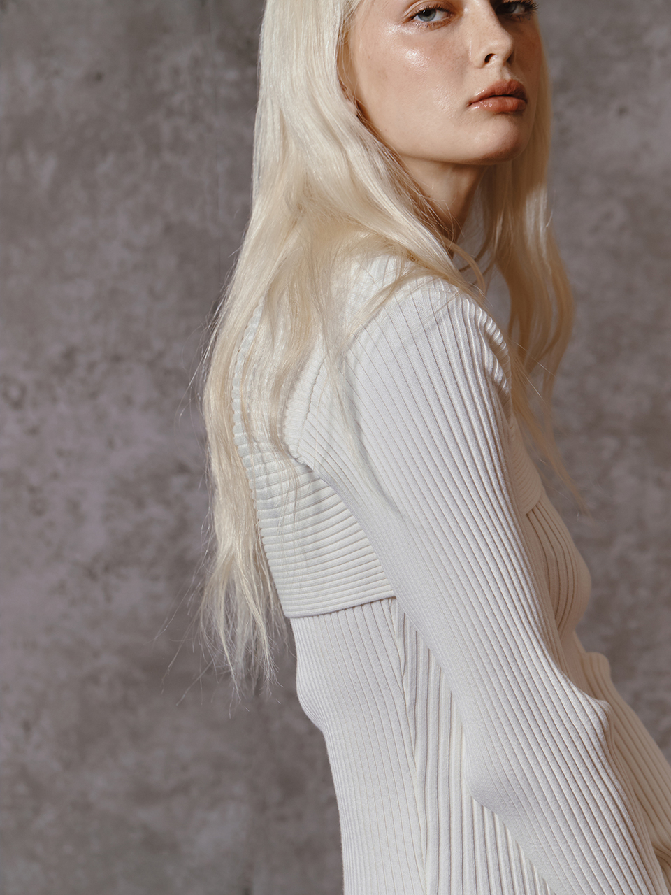 - 신축성 있는 세로 골지 조직으로 슬림한 실루엣 연출 가능