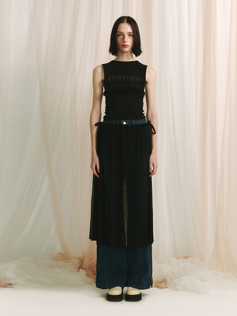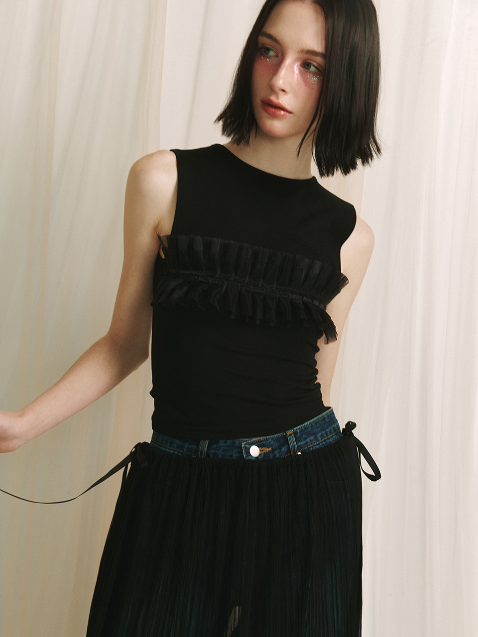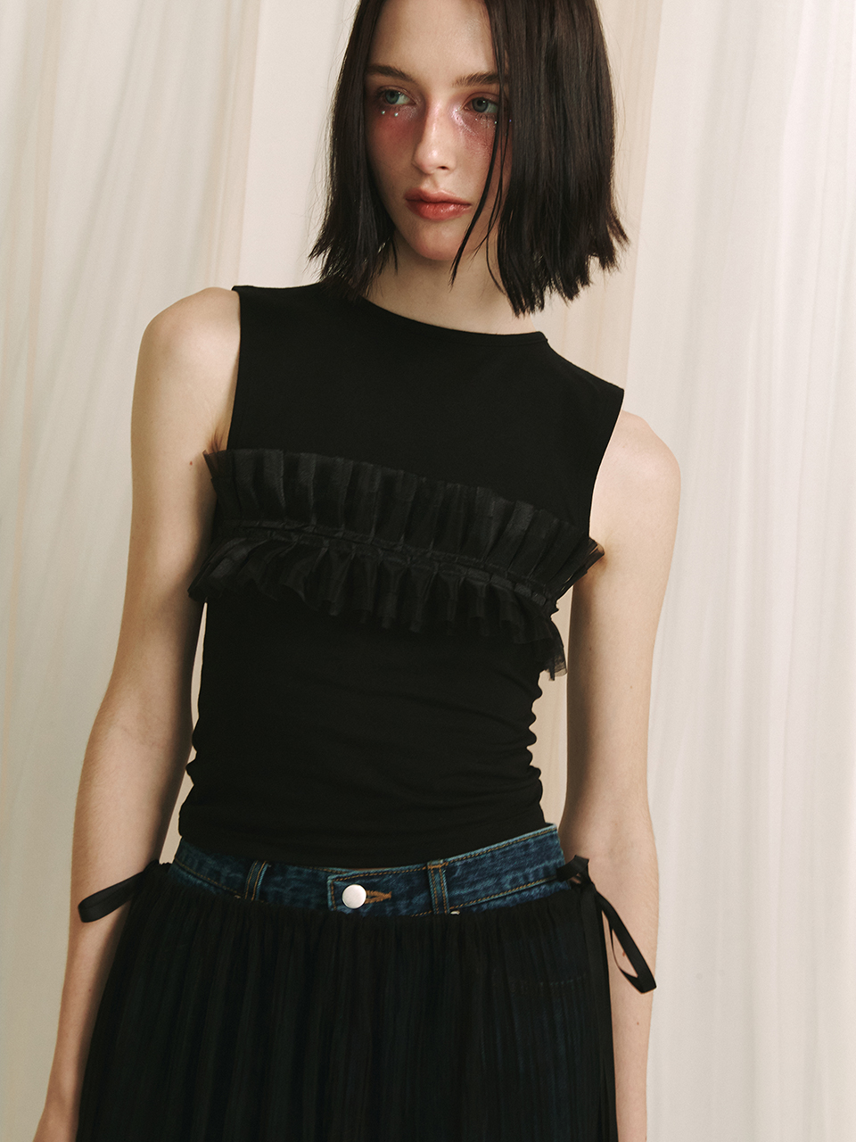 RUFFLE LACE SLEEVELESS TOP - BLACK