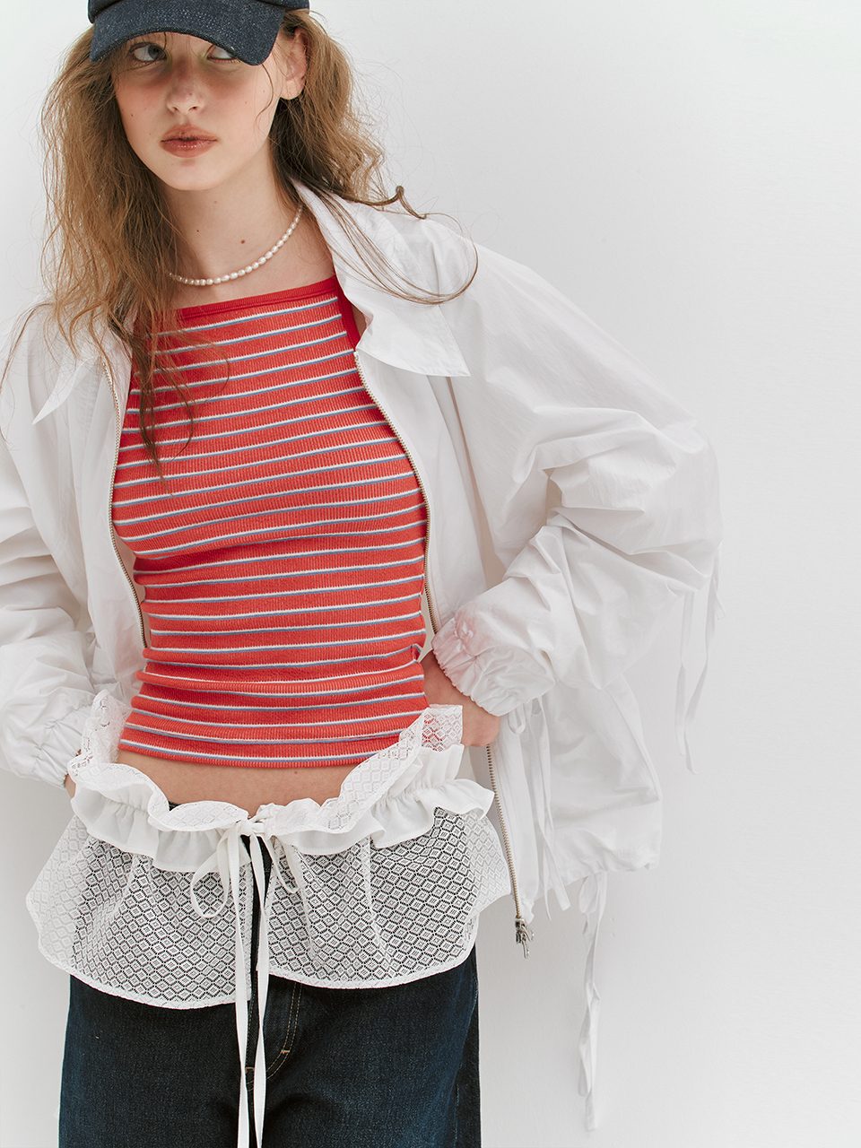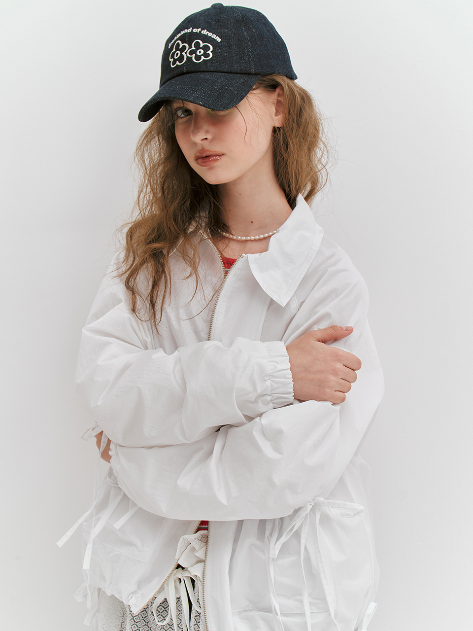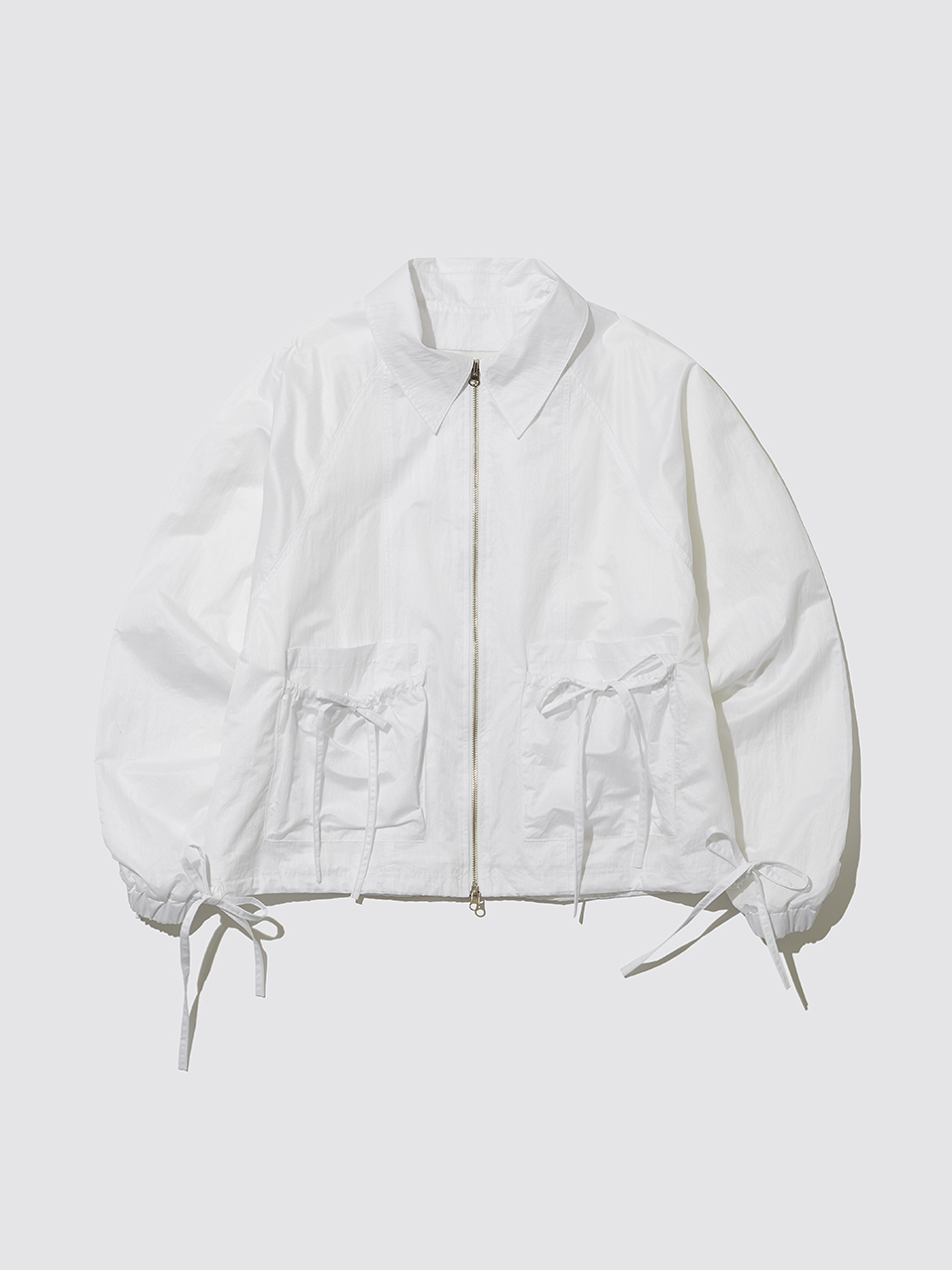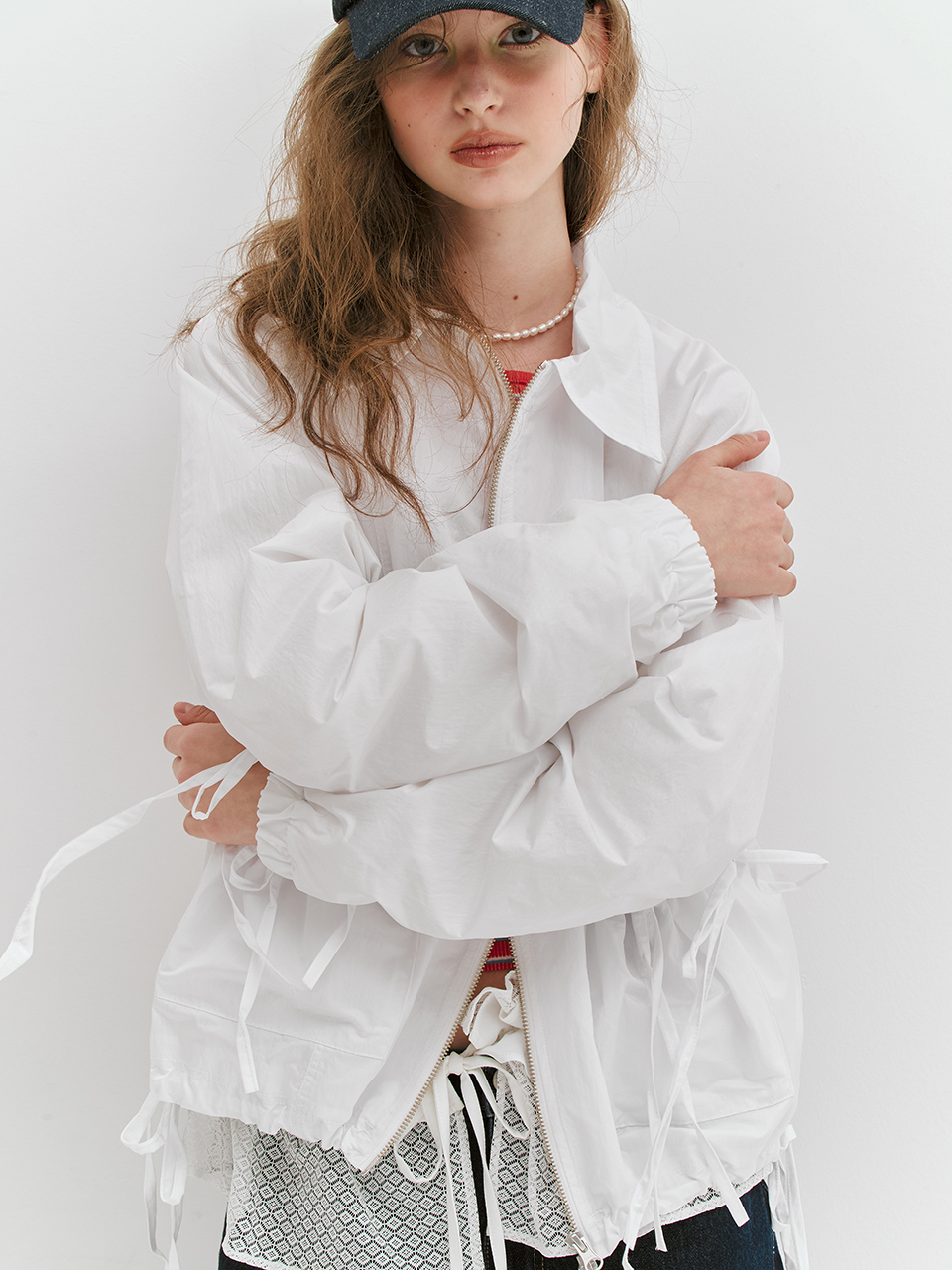 - 셔링 및 리본 디테일이 특징인 집업 재킷