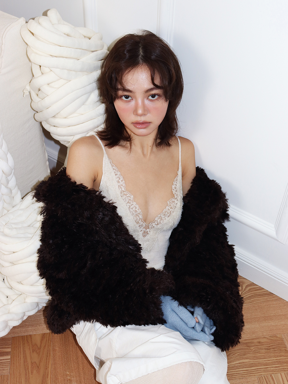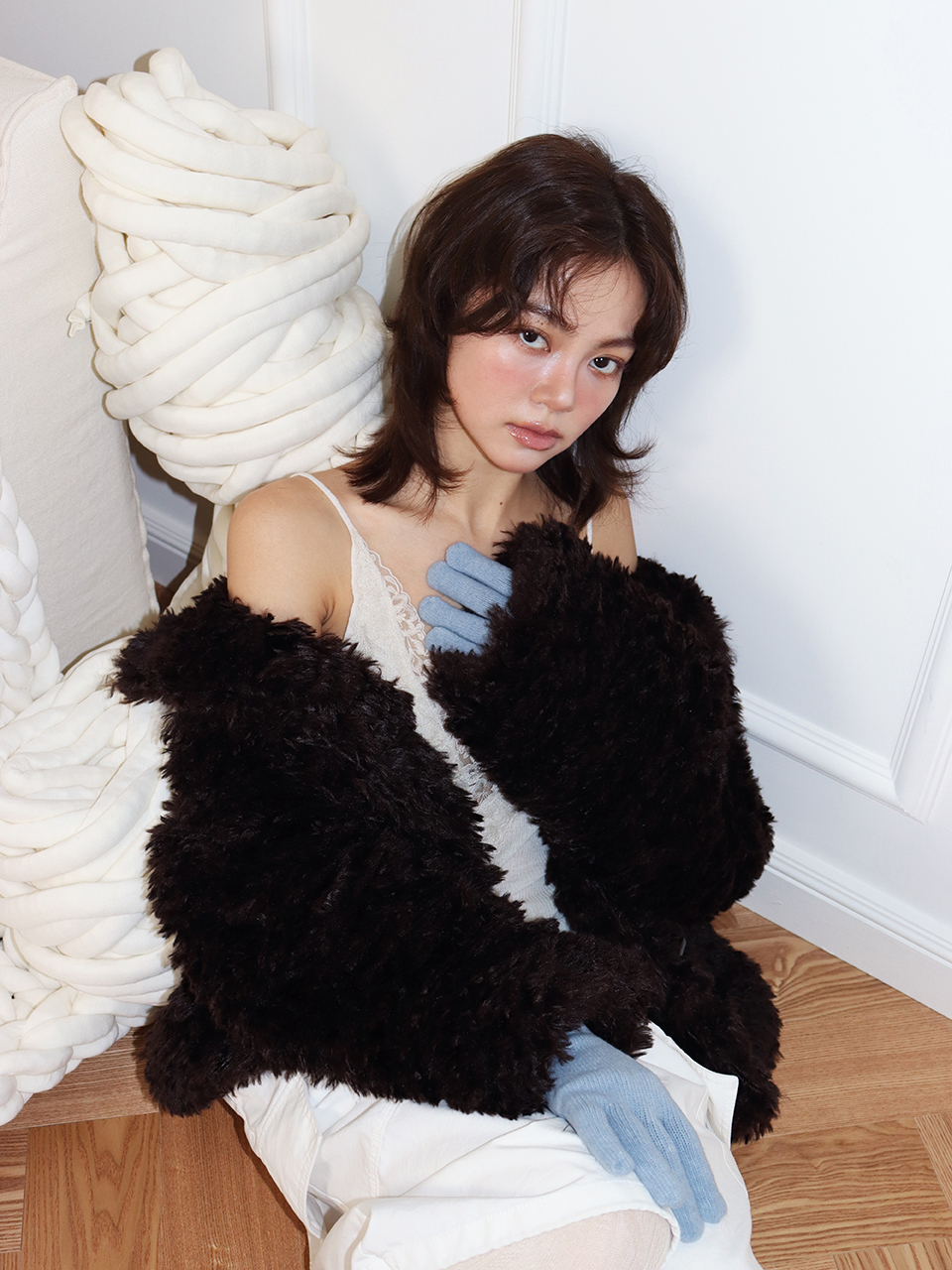 - 부드러운 퍼 소재의 원단으로 제작된 재킷