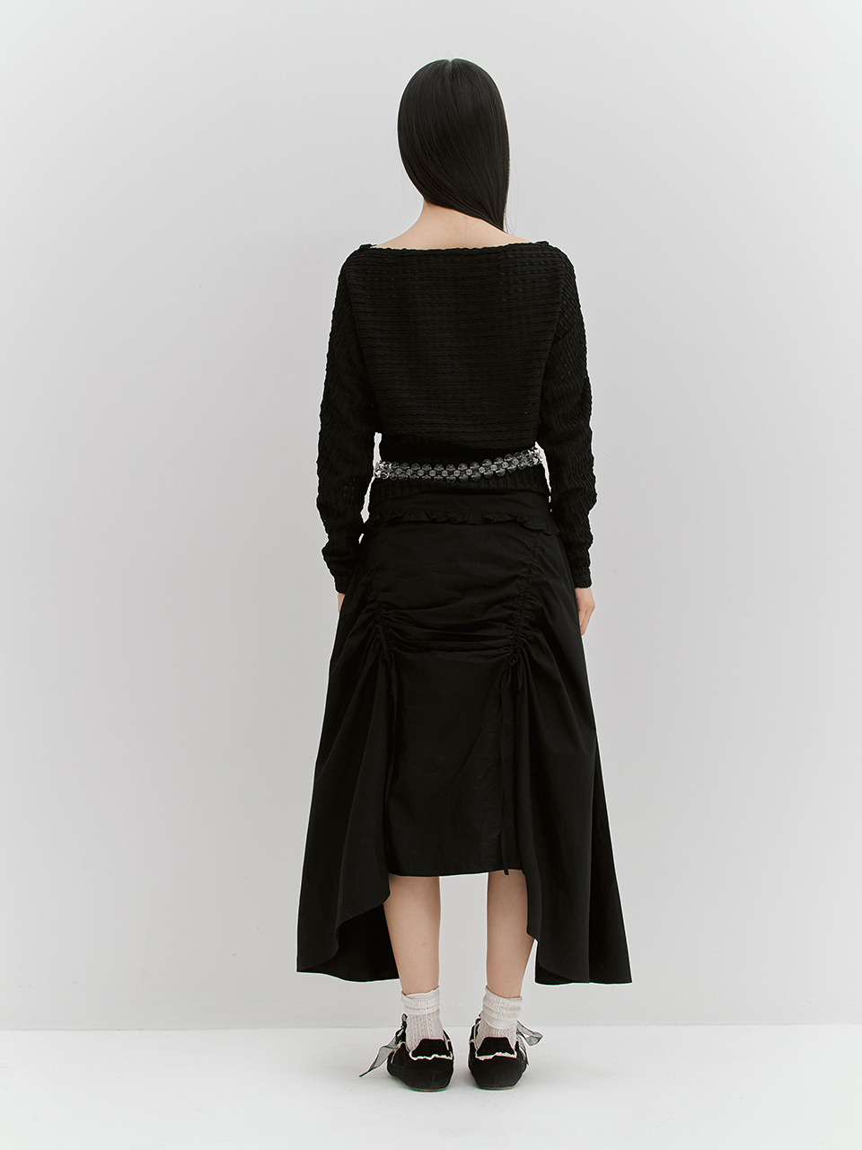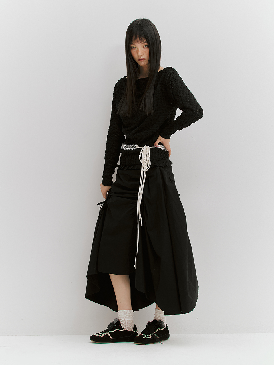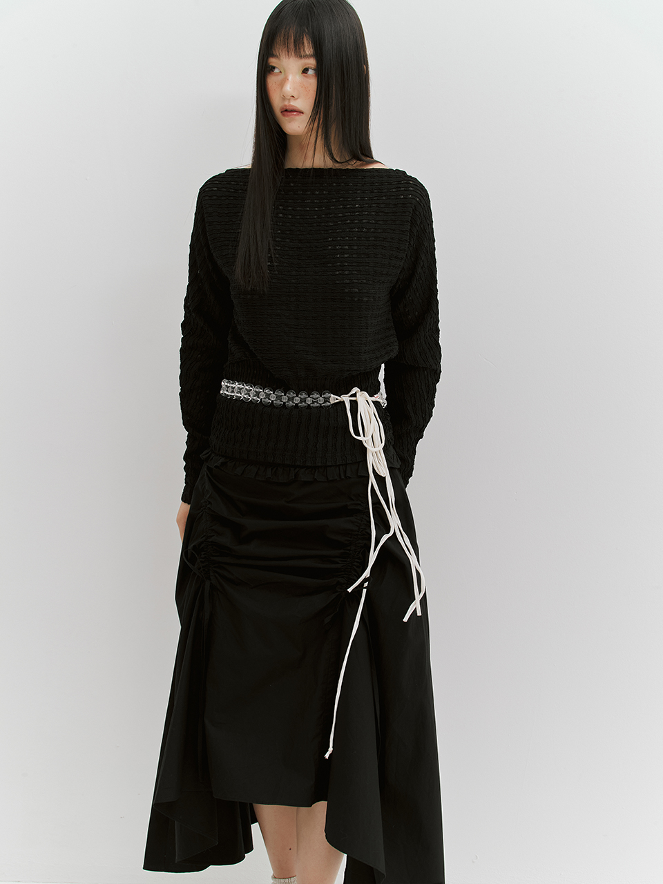 - 웨이브 패턴의 자카드 조직으로 제작된 오프숄더 탑